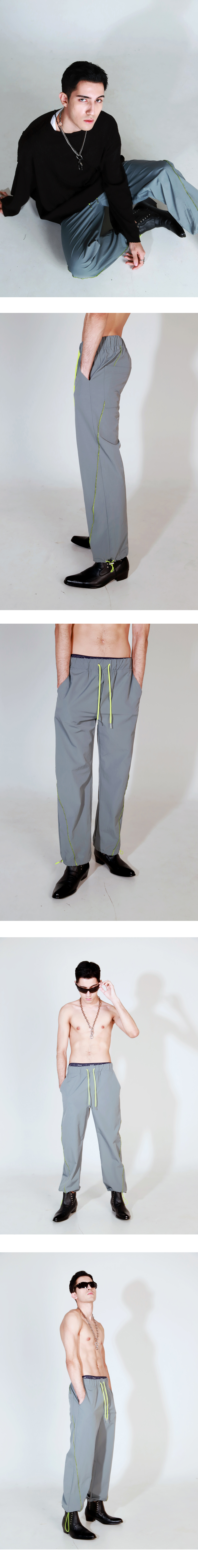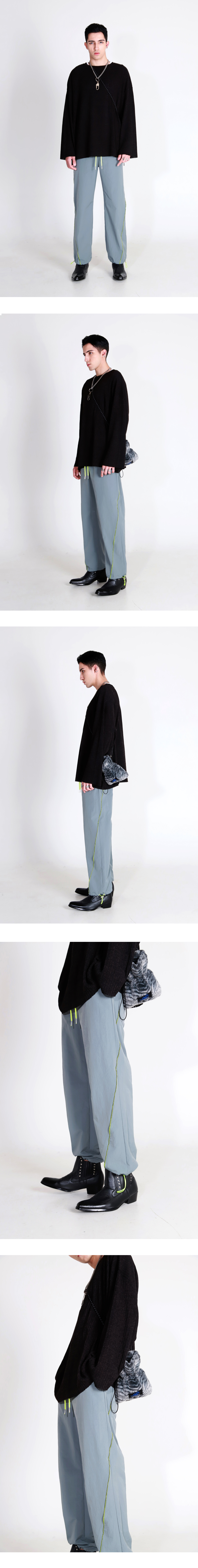 뒤에서 앞으로 가로지르는 사선라인이 매력적인 조거팬츠